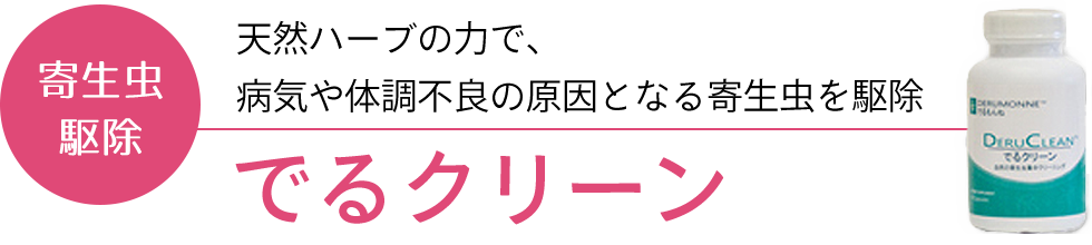 衛生環境が進んだ昨今、寄生虫など体内にいるはずがないと思われるかも知れません。ところが「かくれ寄生虫感染者」の数は意外に多く、アメリカでは「慢性疾患の原因の1つは寄生虫」と発表され問題にもなっています。「でるクリーン」は数十種の良質なハーブをもとに作られた天然の虫下し。寄生虫の駆除だけでなく、その卵や幼虫の駆除にもしっかり働きます。 ※妊娠中の方、授乳中の方、お子様はご使用をお控えください。 <栄養成分>クログルミ、ニガヨモギ、パウダルコ、カボチャ種子、クローブ、オシダ、グレープフルーツ種子、ショウジョウバカマ、ミルラ、ニンニク、ヒソップ、ウコン、ゲンチアナ、ペパーミント、フェヌグリーク、オグルマ、アメリカサンショウナガバギシギシ |