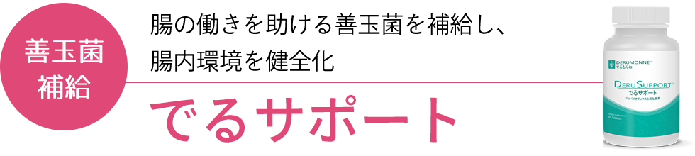人間の腸内にはもともと体に良い働きをする善玉菌(プロバイオティクス)がいます。ところが古い食物残渣や宿便などが溜まってくると毒素を出すなど悪い働きをする悪玉菌が増えるばかりか、逆に善玉菌が減って腸内細菌バランスが崩れ不健康になるのです。そんな時「でるサポート」が役立ちます。たった1粒で10種類の善玉菌・プロバイオティクスが40億個以上も摂取でき、食べ物の分解や消化吸収、解毒効果を高めます。同時に悪玉菌の勢力を弱めるので、腸内細菌のバランスを保ち環境を健全化します。でるもんねプログラムは「でるミックス」「でるクリーン」ですっきりきれいになった腸に善玉菌を補給するから、より効果的なのです。 <栄養成分>植物性乳酸菌ブレンド、カラスムギ、オオムギ |